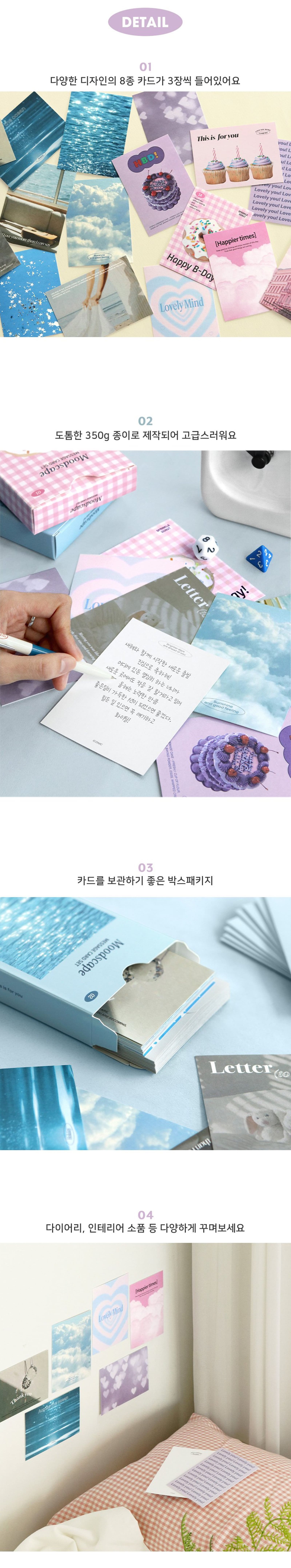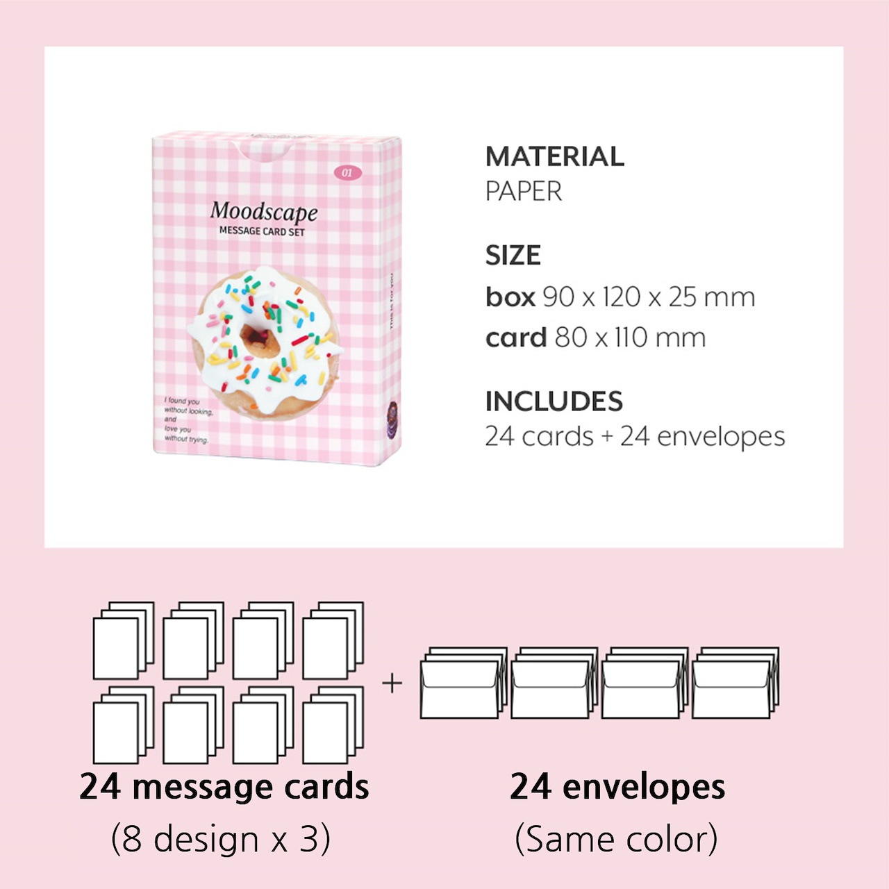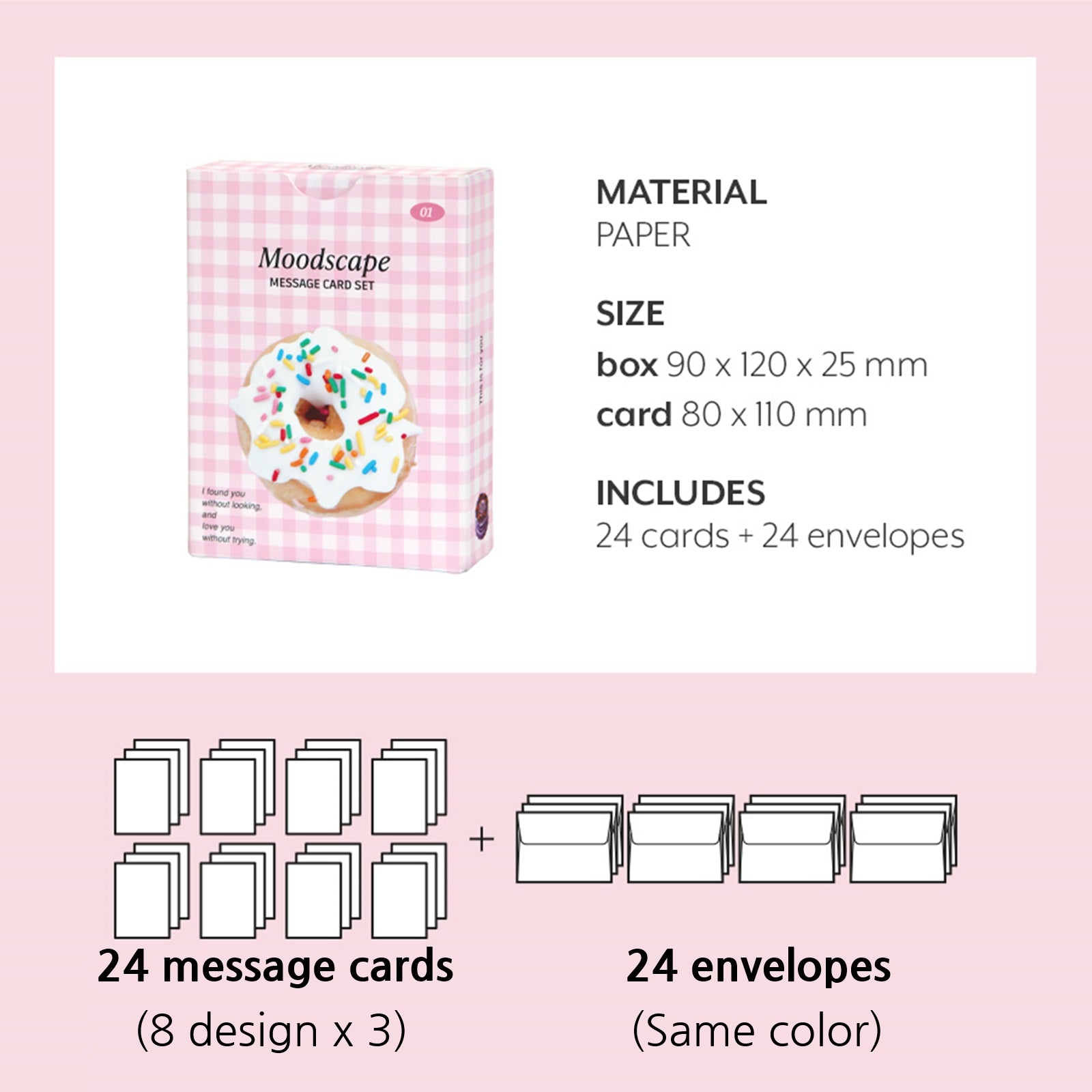 各セットには、80x110mmサイズのメッセージカードが24枚(各デザイン3枚ずつ)、どんな色のカードとも相性抜群なカラー封筒が24枚含まれています。カードには韓国製の350g高級紙を使用し、しっかりとした厚みと質感が高級感を引き立てます。