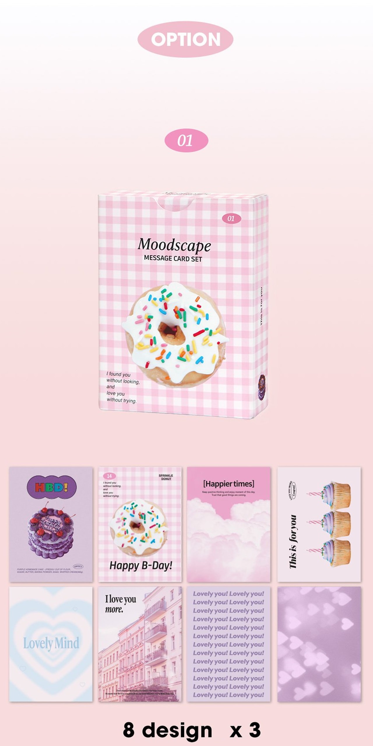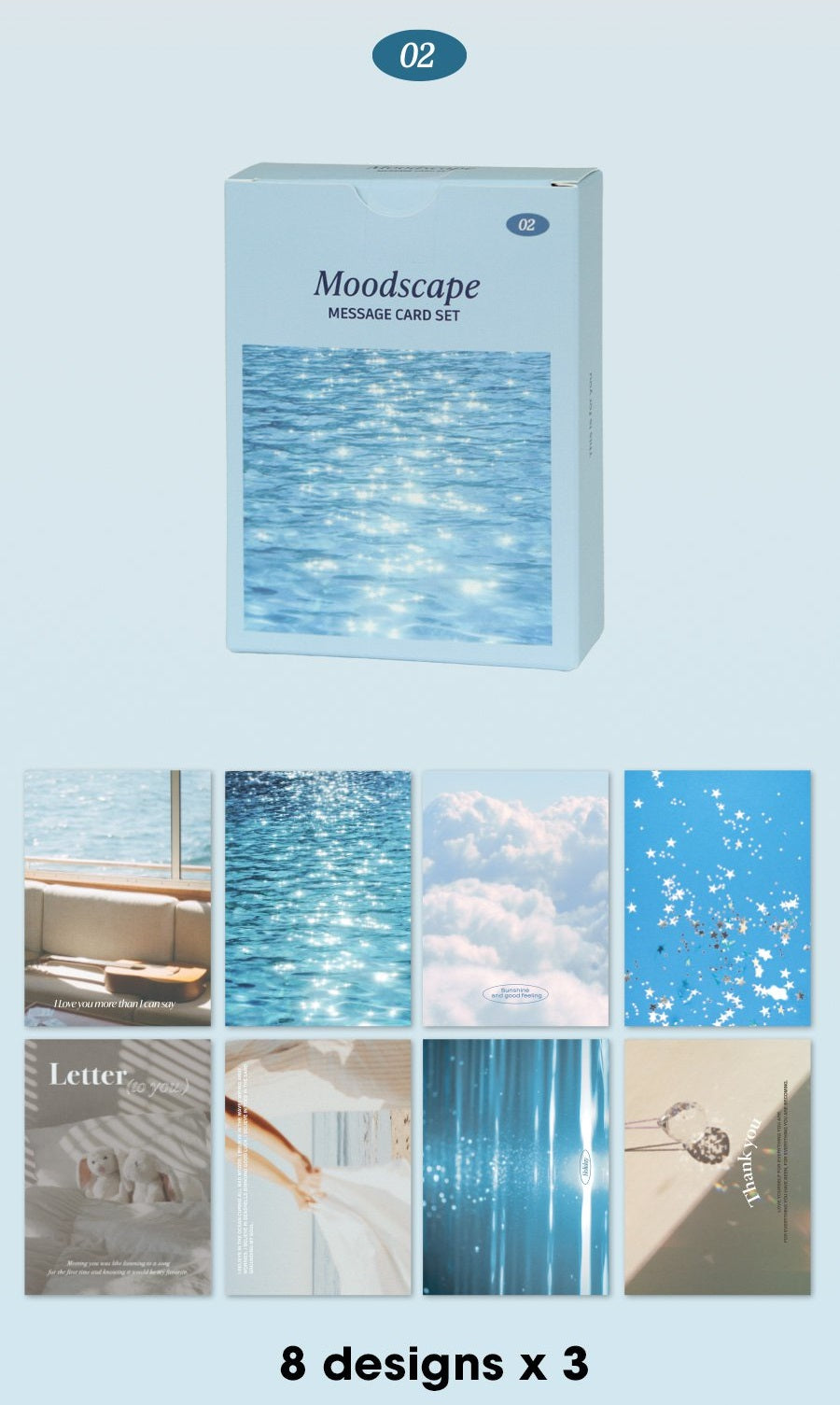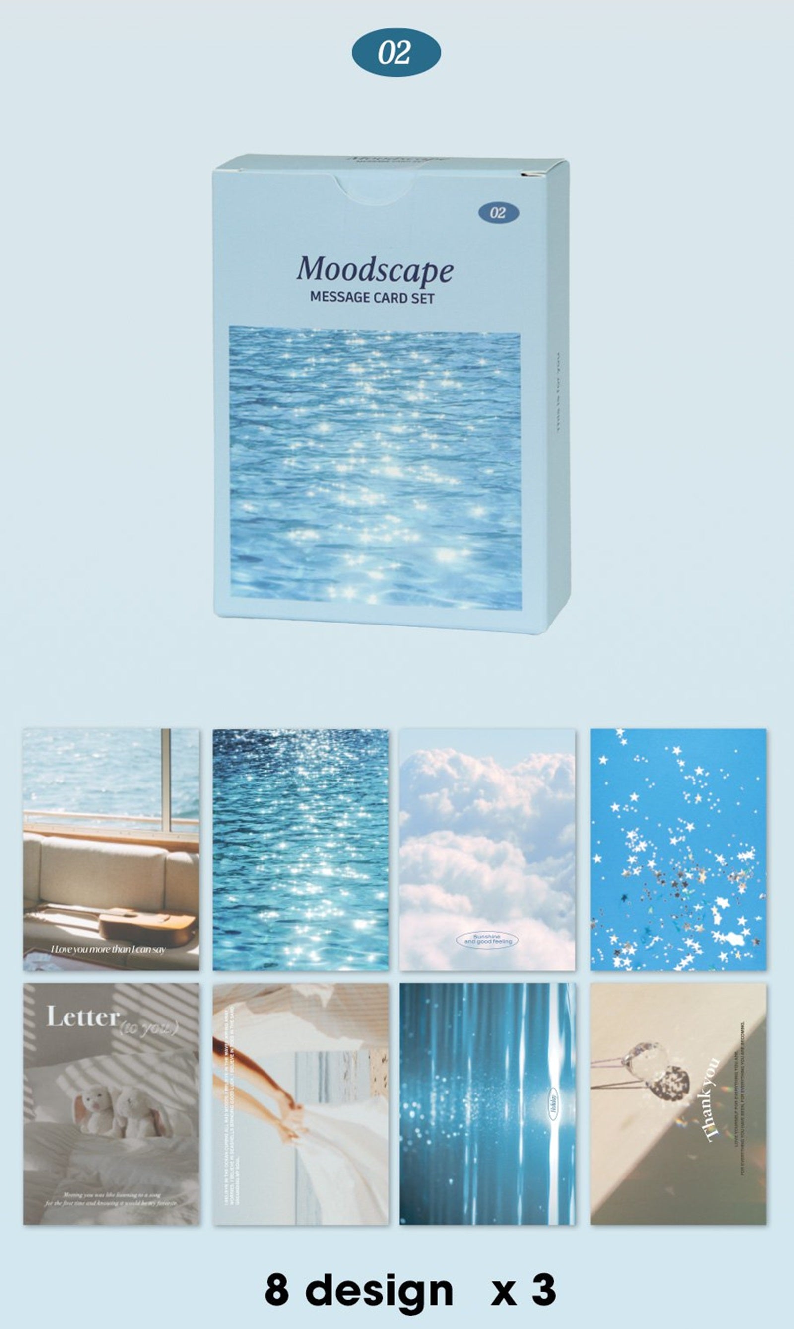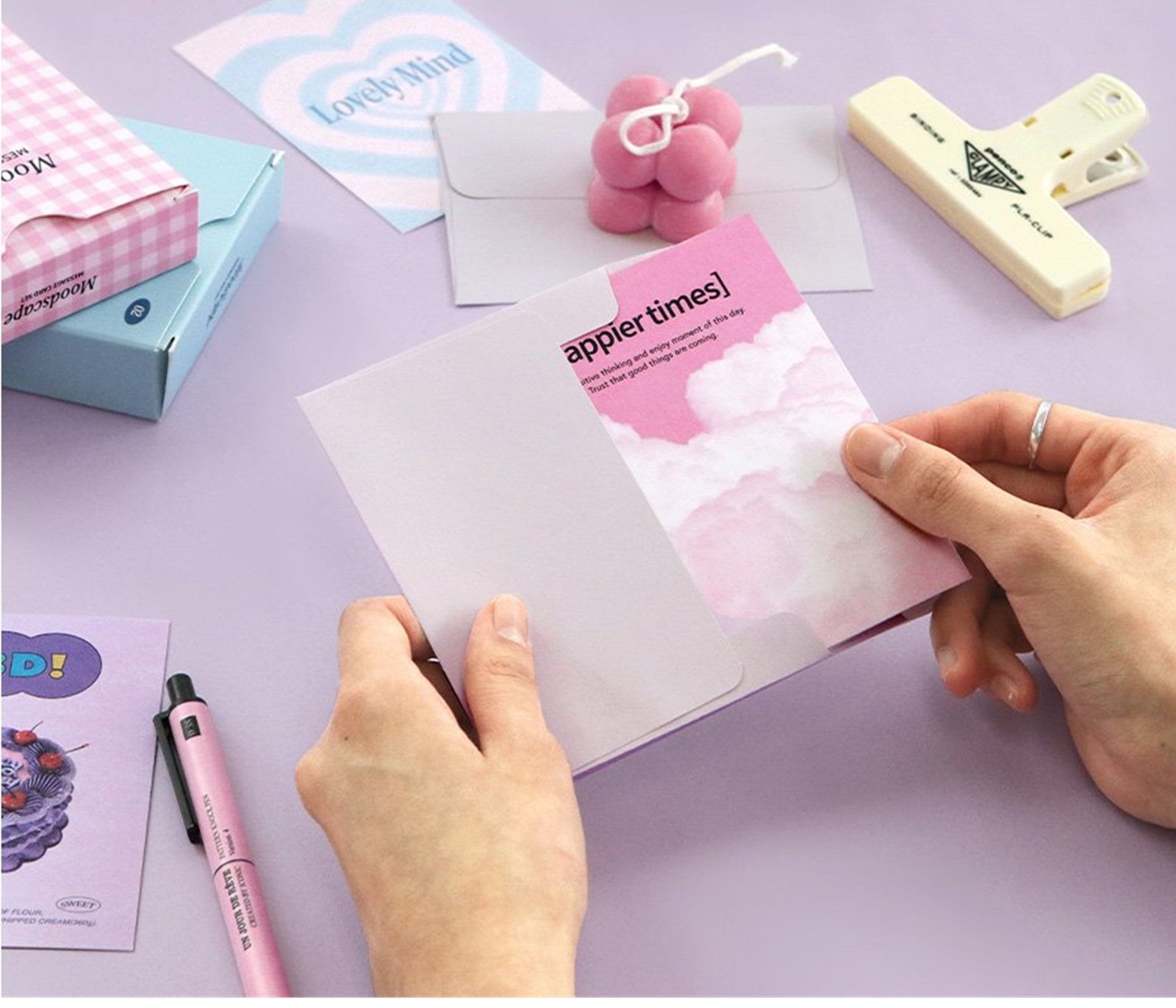 こちらは韓国のアイコニックブランドから登場した「ムードスケープ メッセージカード&封筒セット」です。オプションは2種類あり、それぞれ異なるテーマに基づいたアートが魅力的に描かれています。