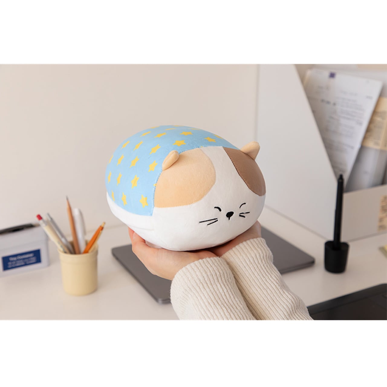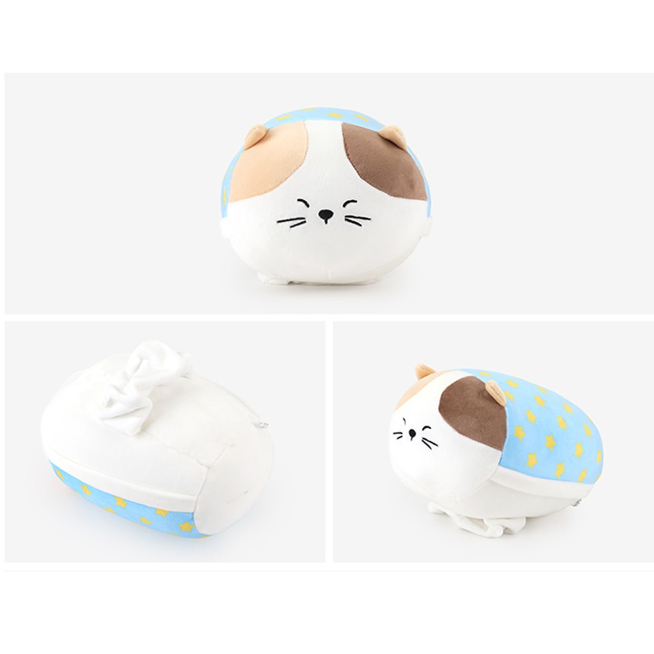 眠っている猫ちゃんの表情がとにかく可愛い!白いベースに、左右で違うカラーの耳と分け目。お布団のような水色×黄色の星柄デザインがポイントです。