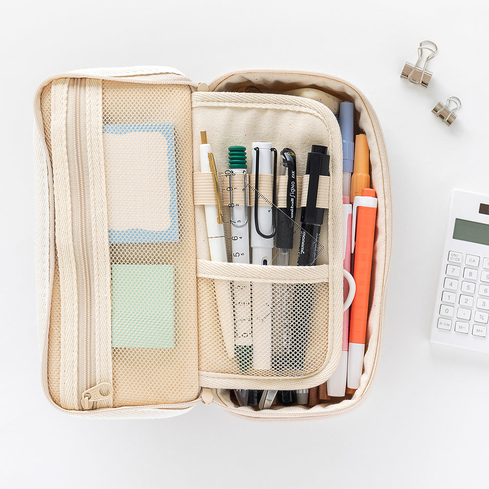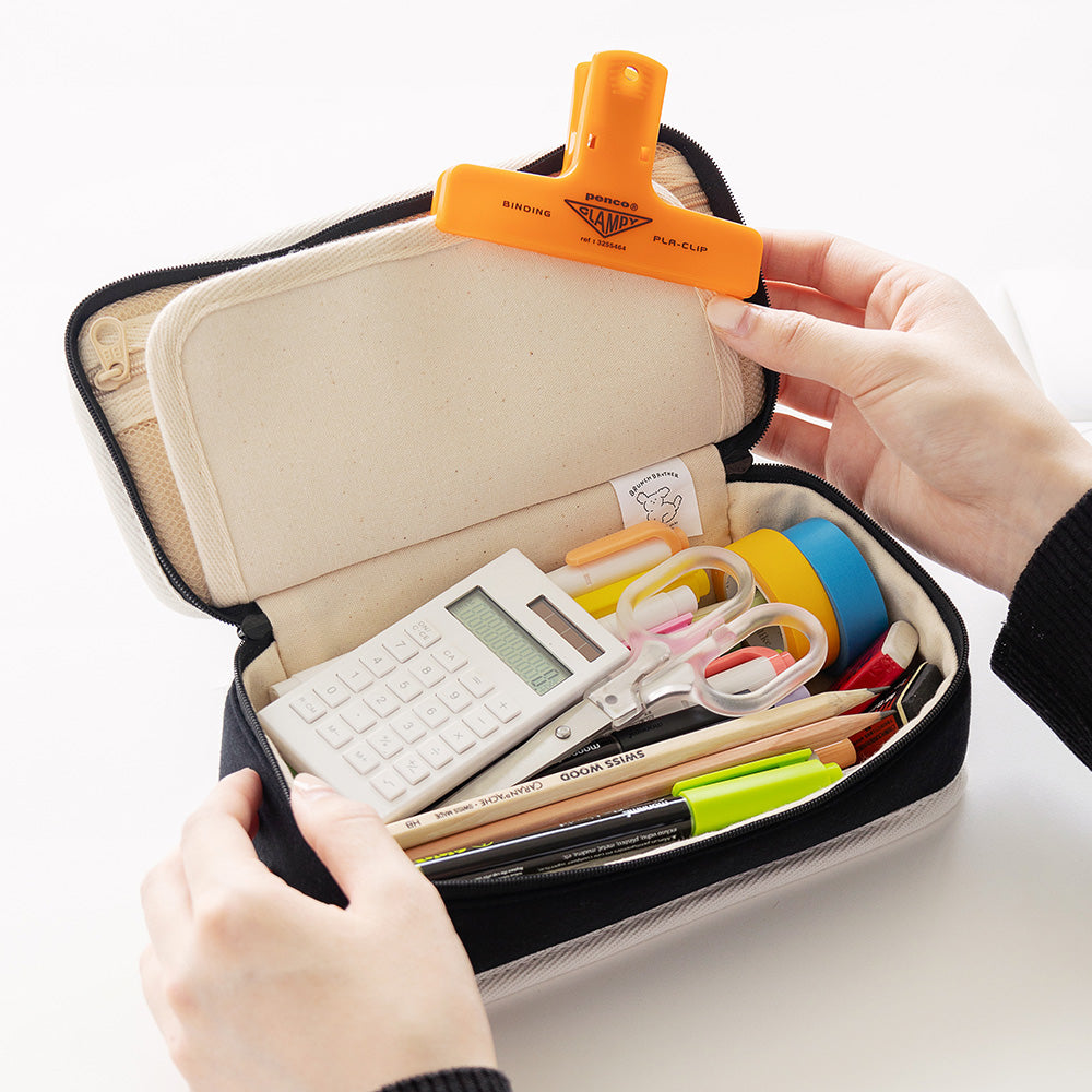 このペンケースは、使い勝手にも優れています。外側には2つのジッパースライダーがあり、フタが180度に開くことで、中身が一目でわかり、必要な筆記具をすぐに取り出すことができます。ペンホルダーには、よく使う5本のペンをきれいに収納でき、取り出しも簡単です。さらに、内部にはメッシュポケットがついており、メモやマスキングテープなどの小物を整理して収納するのにぴったりです。