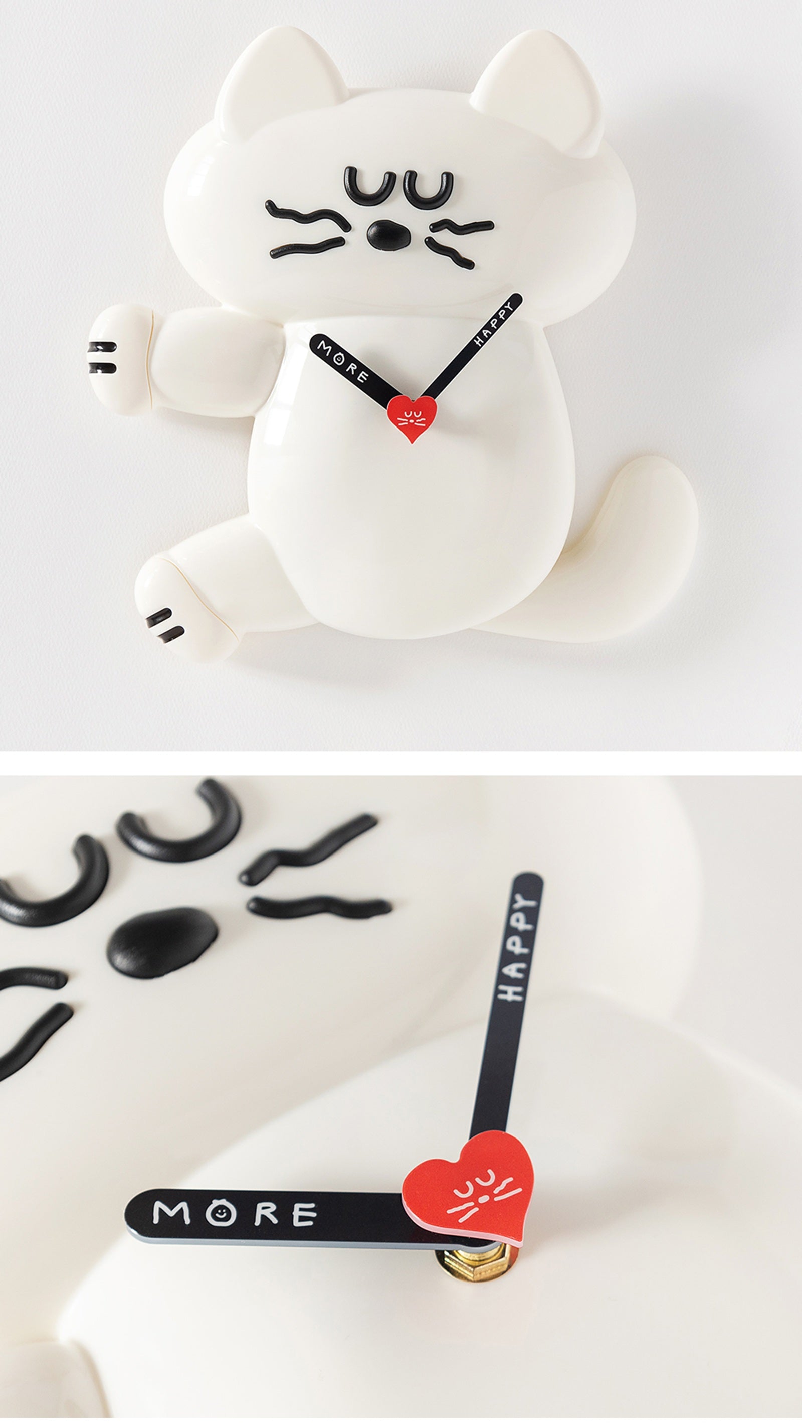 分針には「More」、時針には「Happy」のプリント、360°回転するハートが中心を飾ります。 - 立体感のあるキャラクター: 猫の目、鼻、ひげ、足が感覚的にデザインされ、見るたびに癒される可愛さ。