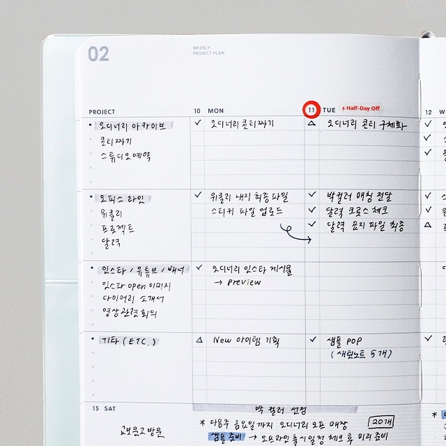 週ごとのプランがプロジェクト別に仕切られ、各タスクの進行をすぐに把握できるデザインです。土日のエリアが小さく設計されており、平日の作業スペースを確保。週単位で効率的に業務を進めたい方にぴったりです。