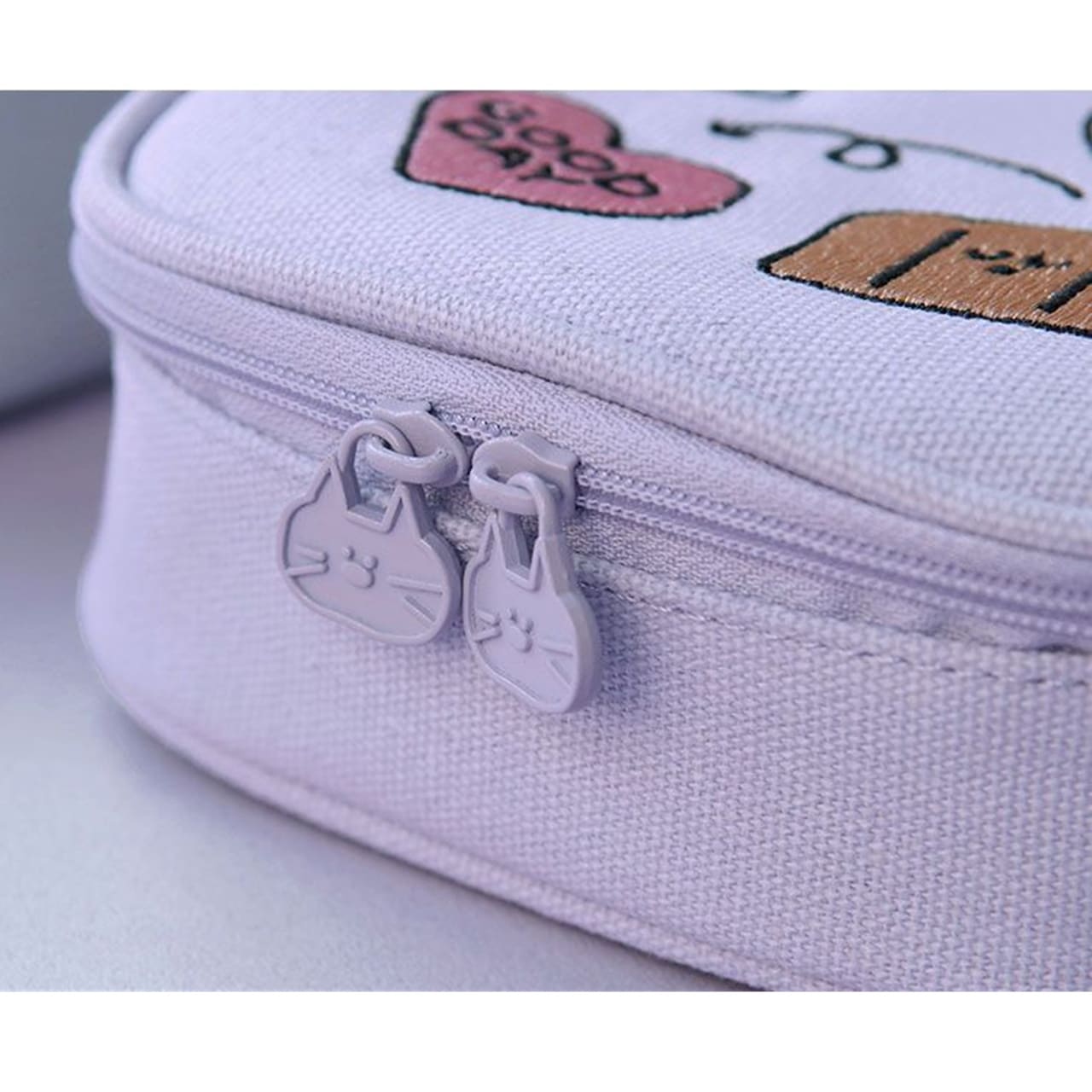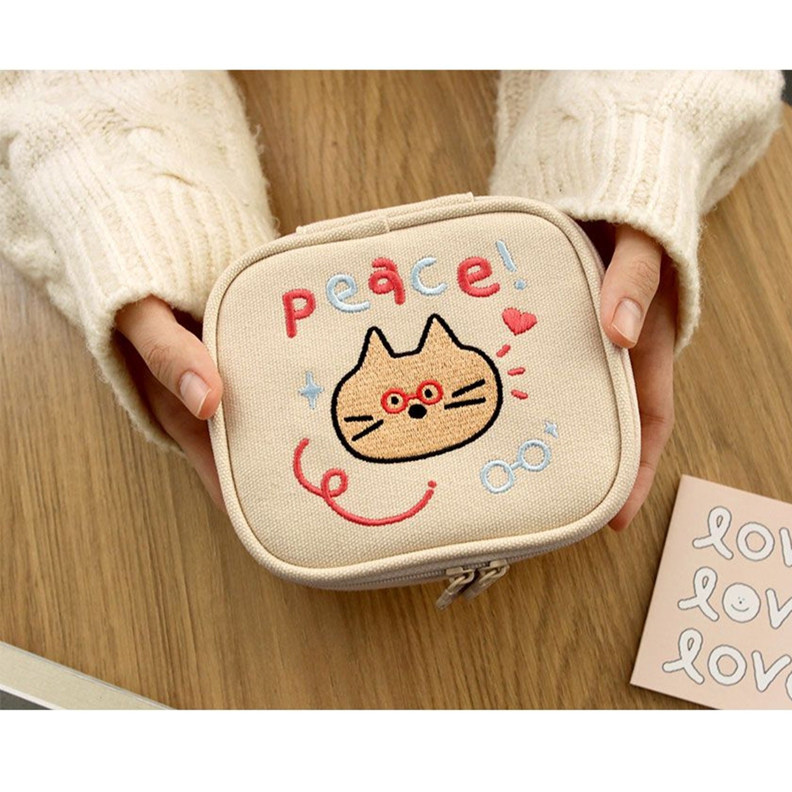 1. Cream Beige:Peace!のレタリングと、ネコのフェイス刺繍